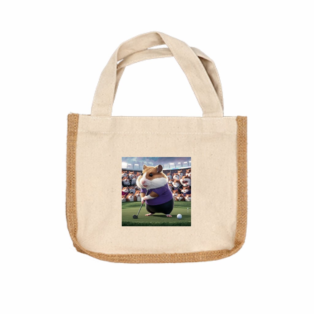 ゴルフを楽しむハムスターのジュート&キャンバスコンビトート(S)