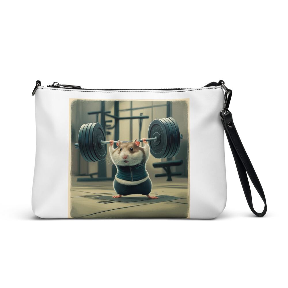 バーベルを持ち上げるハムスターのクロスボディバッグ!かわいらしいハムスターがバーベルを持ち上げるデザインで、日常のお出かけを楽しく演出します!