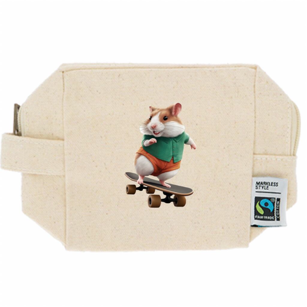 スケボーで走るハムスターのフェアトレードコットンキャンバスファスナーポーチ(S)