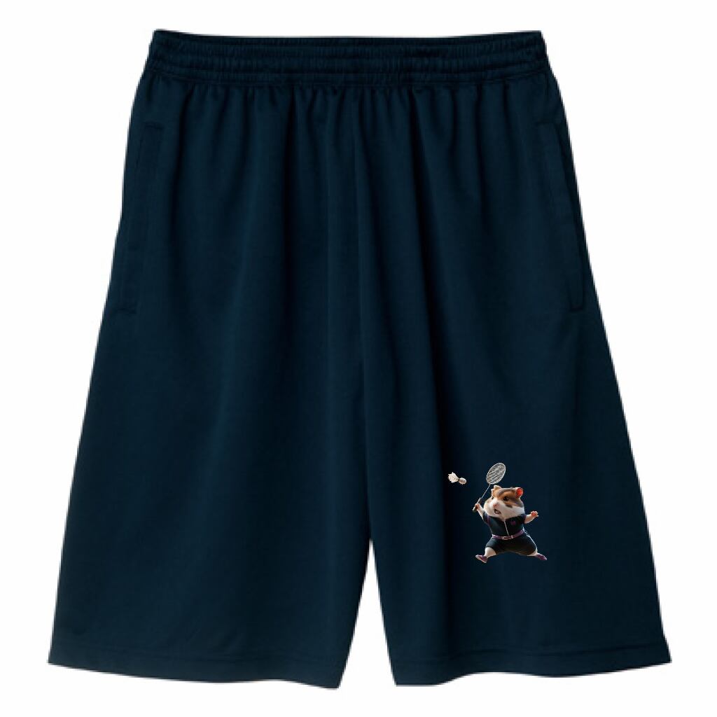 バトミントンをするハムスターのドライハーフパンツ!かわいらしいハムスターがバトミントンを楽しむデザインで、カジュアルスタイルにピッタリのアイテムです。日常使いやスポーツアクティビティに最適です!