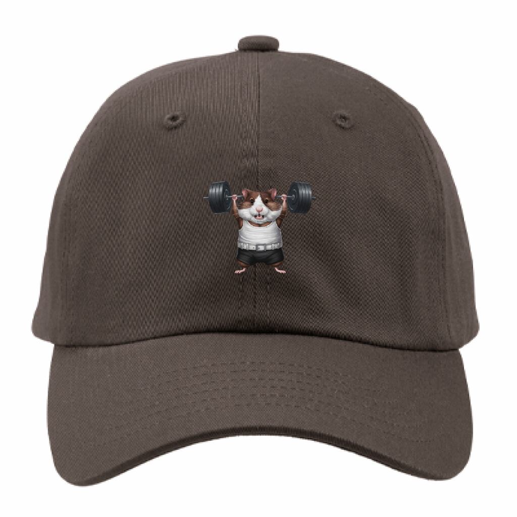バーベルを持ち上げるハムスターのコットンツイルローキャップ!元気いっぱいにバーベルを持ち上げる愛らしいハムスターがデザインされており、毎日のコーディネートにユーモアを添えるアイテムです!
