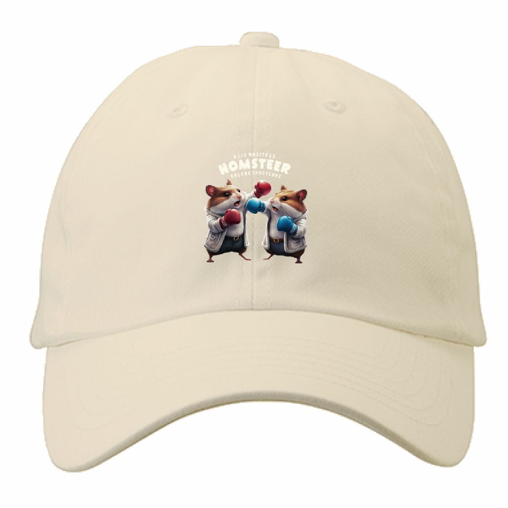 ボクシングの試合中のハムスターのコットンツイルローキャップ!リングの上で戦うハムスターがデザインされており、毎日のコーディネートにスポーティーなアクセントを加えるアイテムです!