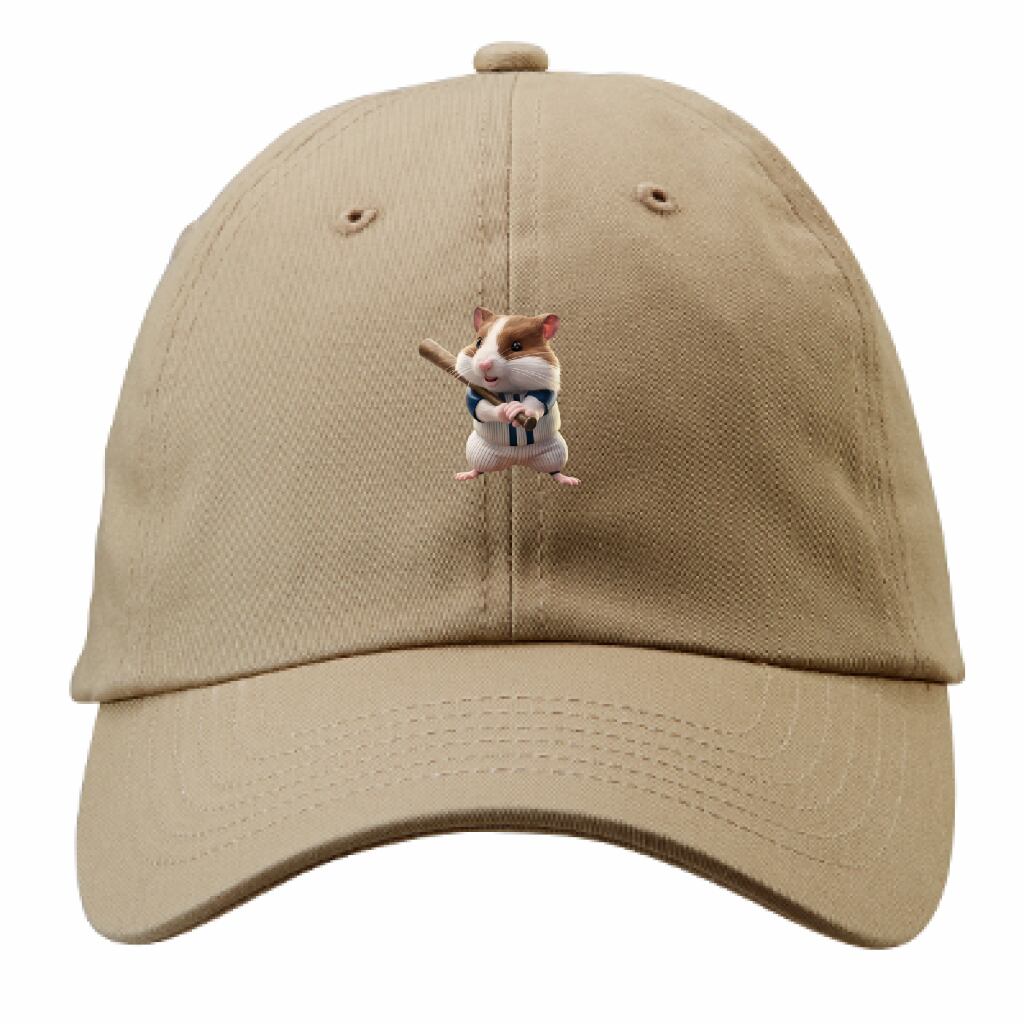 野球をするハムスターのコットンツイルローキャップ!ユニークでかわいらしいデザインが特徴のこのキャップは、カジュアルなスタイルを楽しむのにぴったりのアイテムです!